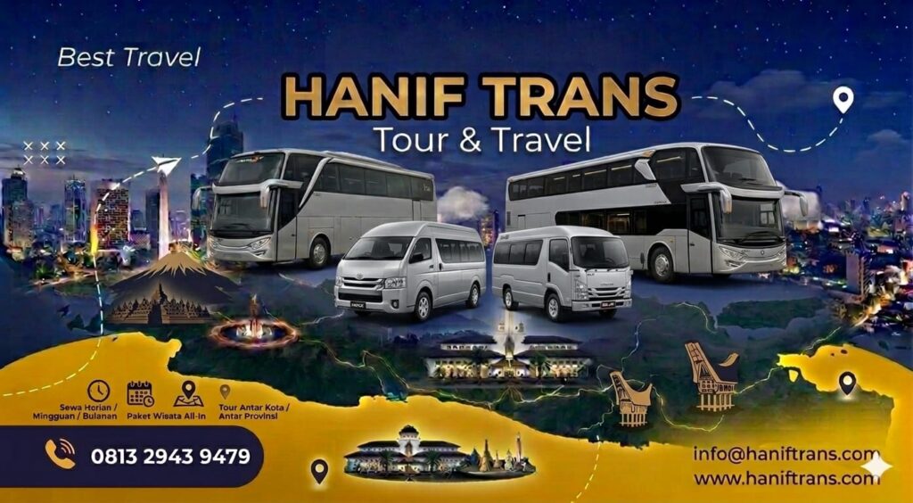 HANIF TRANS adalah solusi transportasi terbaik untuk perjalanan Anda. Dengan layanan kami yang handal, kendaraan berkualitas. Jadi, jadikan perjalanan Anda menjadi momen yang berkesan dengan menyewa armada Elf atau Bus dari kami. Hubungi kami hari ini untuk memesan armada perjalanan Anda dan mulailah petualangan Anda dengan gaya!