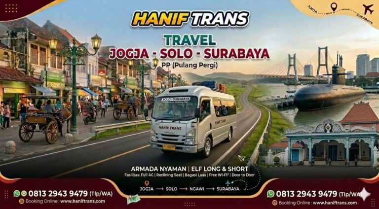 Hanif Trans merupakan perusahaan yang bergerak di bidang jasa travel & tour rute dari Jogja, Klaten & Solo tujuan Surabaya atau sebaliknya. Kami hadir sebagai solusi perjalanan aman dan nyaman dengan layanan door to door serta opsi reguler maupun charter, sesuai kebutuhan pelanggan. Anda akan dilayani oleh pengemudi berpengalaman dengan pilihan armada lengkap dan modern.